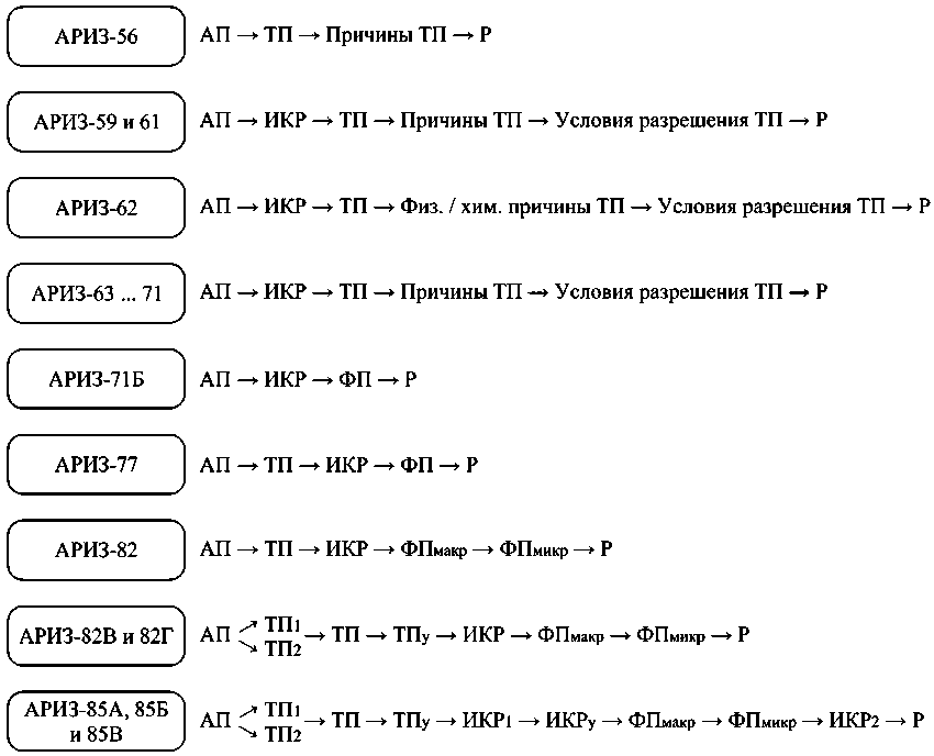 * АП — административное противоречие ; ТП — техническое противоречие ; ТПу — техническое противоречие усиленное ( предельное состояние ); ИКР — идеальный конечный результат ; ИКР 1 — идеальный конечный результат ( усиленная формулировка ); ФП — физическое противоречие ; ФПмакр — физическое противоречие на макроуровне ; ФПмикр — физическое противоречие на микроуровне ; Р — решение