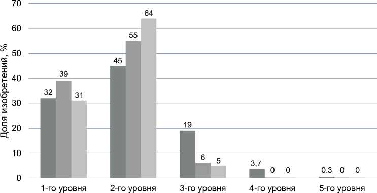 Fig. 2. The number of inventions of different levels in different periods of research улучшений известных технических решений (часто формулы изобретений пишут с ограничительной частью, когда известные признаки дополняются новыми, с получением другого технического результата).