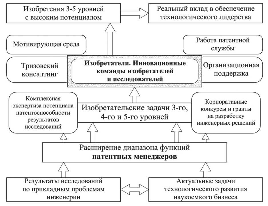 Более глубокая интеграция исследовательской и изобретательской деятельности предполагает расширение диапазона патентных исследований и аналитики, включая построение патентных ландшафтов по актуальным технологическим направлениям для задач технологического лидерства. С помощью патентных исследований и аналитики можно выявлять перспективные технологические области на мировом рынке для наукоемких отечественных компаний [31], а также ставить изобретательские задачи высоких уровней, актуальные для развития как результаты комплексных НИОКР или мегапроектов, реализуемых в ведущих университетах.