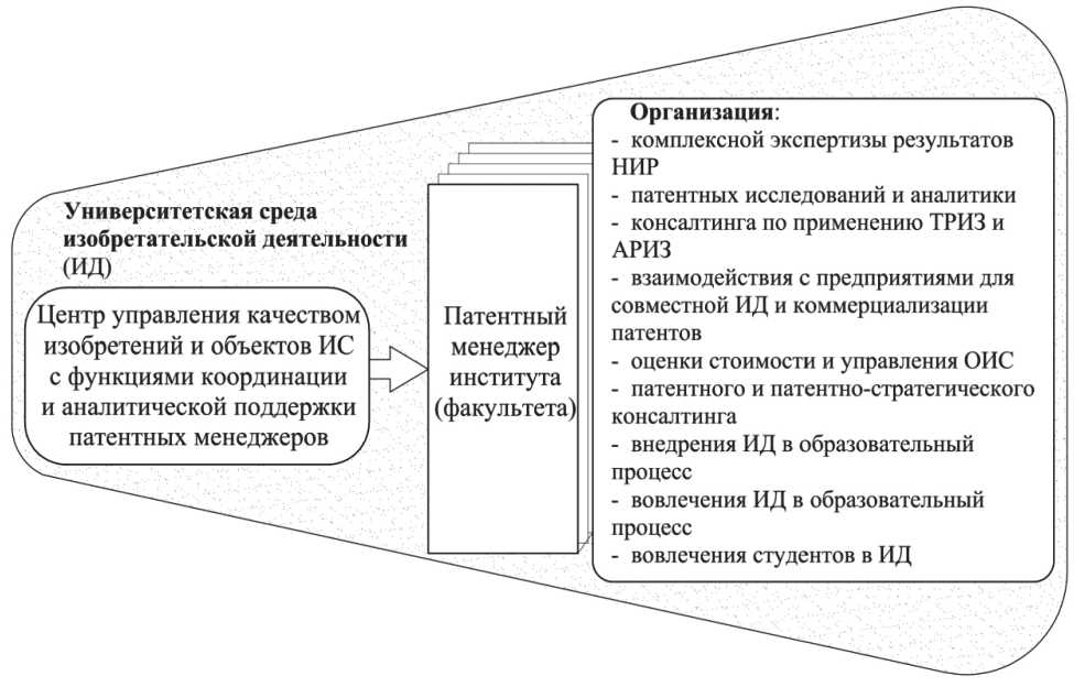 Задача существенного повышения уровня вузовских изобретений по критерию их влияния на технологическое развитие требует создания специальной инфраструктуры изобретательского процесса. Для ее построения предлагается следующая модель организации вузовской ИД (рис. 4).