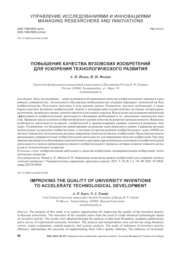 Цель исследования – поиск возможностей повышения качества изобретательского процесса в российских университетах. Актуальность обусловлена необходимостью создания передовых технологий на базе изобретательства. Результаты получены в ходе анализа данных Роспатента, научных публикаций, а также опроса опытных вузовских изобретателей. Анализ и интерпретация осуществлялись на основе литературных источников, экспертных оценок, контент-анализа и системного анализа. В результате исследования показателей эффективности изобретательской деятельности обоснована необходимость их дополнения показателем качества. Проведен анализ влияния изобретений разного уровня качества на развитие промышленности. Выявлены особенности деятельности вузовских изобретателей и проанализирован уровень сложности решаемых ими задач. Установлено, что большинство ориентировано на решение задач невысокого уровня. Сравнение методов, используемых вузовскими изобретателями, и методов алгоритма решения изобретательских задач (АРИЗ) позволило определить методические ресурсы повышения качества вузовских изобретений. Представлена модель организации университетской изобретательской деятельности для повышения качества изобретений. Научная новизна заключается в обосновании дополнительного критерия определения результативности изобретательской деятельности и модели организации вузовского изобретательского процесса, которые позволят повысить вклад вузов в технологическое лидерство.