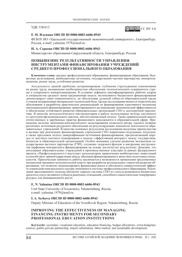 The relevance of this problem is determined by the profound structural changes in the labor market, which are caused by the need to ensure the country’s technological sovereignty and accelerate import substitution. In the context of a shortage of qualified workers and mid-level specialists, the traditional model of extensive budgetary financing demonstrates its limitations, as it does not provide sufficient flexibility in the educational environment and the pace of modernizing the material and technical base. The purpose of the study is to provide a theoretical basis and develop practical recommendations for creating an adaptive mechanism for multi-channel financing aimed at increasing economic efficiency and ensuring sustainable development of secondary vocational education organizations in the long term. The study uses methods of systemic and structural-functional analysis, as well as an institutional approach, as its methodological tools. It also includes a comparative analysis of domestic and foreign practices of financial management in the educational sector. The use of economic and mathematical modeling methods allowed the author to assess the impact of various sources of resource provision on the performance indicators of educational institutions. The main results of the study highlight the advantages and challenges in implementing the financing of vocational education institutions using the per capita regulatory approach, as well as an approach to diversifying funding sources, suggesting a transition from strict cost-based planning to an “effective contract” model between the government, business and an educational organization. Special attention is paid to the development of public-private partnership (PPP) mechanisms, the creation of endowment funds and the introduction of performance contracting tools (financing based on achieved results). It has been proven that the integration of educational institutions into production clusters (as part of the federal project “Professionalism”) acts as a catalyst for attracting non-budgetary investments and contributes to a direct correlation between the volume of funding and the quality of training specialists. The practical significance of this work lies in the possibility of applying the proposed mechanisms by executive authorities when developing regional education development strategies, which will minimize financial risks and ensure a synergistic effect from the interaction between the real sector of the economy and the professional education system. The implementation of this approach will ensure that the professional education system transitions from being a recipient of budgetary funds to becoming an active participant in market relations, capable of generating resources for innovative growth independently.
