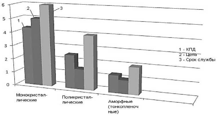 Сравнительные характеристики различных типов фотоэлементов представлены на Рисунке 2. Помимо фотоэлектрических систем, широко применяется гелиотермальная энергетика, основанная на преобразовании солнечного излучения в тепловую энергию. Основным элементом таких систем является солнечный коллектор, предназначенный для нагрева теплоносителя и последующего использования тепла в системах отопления и горячего водоснабжения. Солнечные коллекторы могут быть плоскими и трубчатыми (вакуумными). Плоские коллекторы отличаются меньшей стоимостью, однако обладают более низкой эффективностью по сравнению с вакуумными системами. При установке солнечных коллекторов важным фактором является ориентация на юг с допустимым отклонением не более 30°, что обеспечивает оптимальную выработку тепловой энергии.