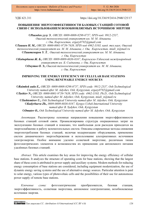 Устойчивая тенденция роста объемов потребления, стоимостей добычи и транспортировки, ограниченных по своим запасам не возобновляемых энергоресурсов, вызывает все большую необходимость использования в народном хозяйстве возобновляемых источников энергии (ВИЭ). Эта проблема приобретает еще большую актуальность в связи с обострением за последние годы проблем охраны окружающей среды. Сегодня, перед государством остро стоит задача повышения энергоэффективности при производстве, передаче и потреблении энергии в стране. Развитие сетей сотовой связи сопровождается постоянным увеличением количества базовых станций, что приводит к росту энергопотребления телекоммуникационной инфраструктуры. В условиях размещения базовых станций в удалённых районах и при отсутствии надёжных электрических сетей проблема энергообеспечения становится особенно актуальной. Во многих случаях такие базовые станции вынуждены работать на дизель-генераторных установках, что приводит к росту эксплуатационных затрат и негативному воздействию на окружающую среду. В связи с этим актуальной задачей является повышение энергоэффективности базовых станций и внедрение альтернативных источников энергии, прежде всего солнечной энергетики, позволяющей обеспечить автономную и экологически чистую работу объектов связи. Солнечные батареи (фотоэлектрические преобразователи) представляют собой устройства, предназначенные для трансформации солнечной (лучистой) энергии в электрическую. Солнечная электростанция состоит из солнечных батарей, контроллера заряда, аккумуляторов, инвертора, компонентов защиты от перенапряжения и молнии, резервного генератора. Их широкое применение обусловлено возможностью получения чистой энергии в различных секторах. В частности, они интегрируются в автономные и сетевые энергетические системы как бытового, так и промышленного назначения. В агропромышленном комплексе фотоэлектрические установки используются для обеспечения электропитанием насосного оборудования и других периферийных устройств. Кроме того, фотоэлектрические панели применяются в качестве источников питания и зарядных устройств для портативной электроники, включая смартфоны и ноутбуки [1-3].