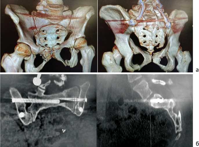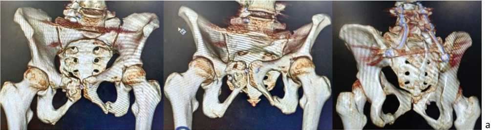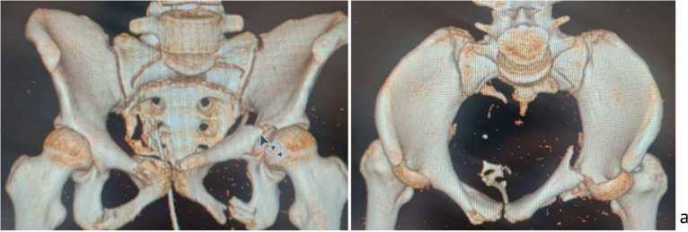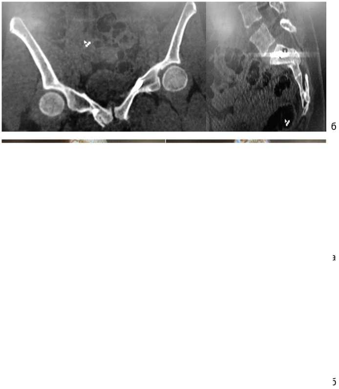Рис. 5. Компьютерные томограммы таза, шесть месяцев после операции: а — 3D-реконструкции