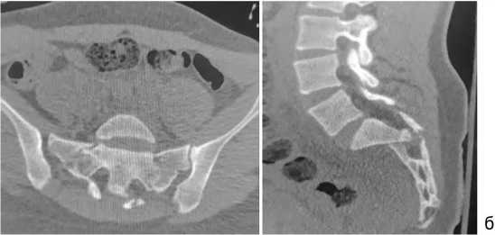 Рис. 1. Компьютерные томограммы таза пациентки при поступлении в стационар: а — 3D-реконструкции; б — сканы в аксиальной и сагиттальной проекциях