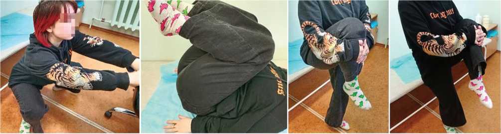 Пациентка была осмотрена травматологом-ортопедом Архангельской областной клинической больницы через шесть и 12 мес. после операции. Результатом лечения пациентка довольна, ходит с полной нагрузкой на обе нижние конечности, не хромает. Отеки, деформации в области конечностей не определяются. Приседания — безболезненные, движения в коленных, тазобедренных суставах не ограничены, безболезненные (рис. 4). Послеоперационные рубцы в области таза — без воспалений. Нагрузка на крылья подвздошных костей — безболезненная. Чувствительность и движения пальцев стоп не нарушены. Функции тазовых органов сохранены.