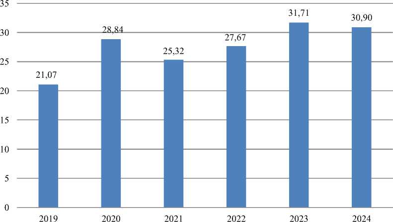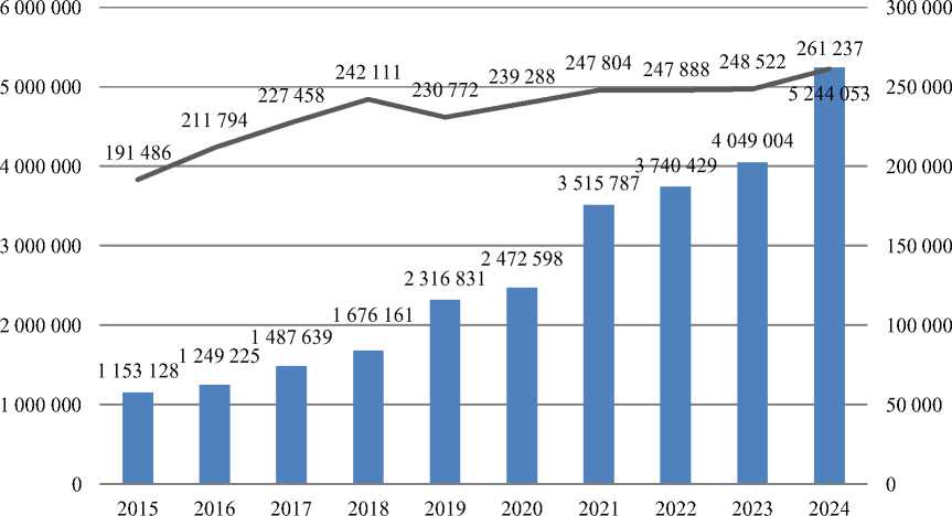 Тенденция интенсификации внедрения цифровых технологий наблюдается и в Российской Федерации, она обусловлена множеством факторов, в том числе ограничением доступа к зарубежным технологиям в связи с санкциями, в совокупности с необходимостью обеспечения технологического суверенитета. Прирост выручки в сфере облачных услуг (IaaS, PaaS и SaaS) в России за 2023 год составил 31 %, что превышает общеми- ровые значения на треть (23 %) [1]. Согласно данным Росстата3, с 2003 по 2024 гг. количество ПК в организациях в расчете на 100 человек увеличилось в 3,7 раза с 18 до 67 шт., число организаций, внедряющих и использующих цифровые технологии, выросло на 36 %, совокупные затраты на цифровизацию выросли в 3,5 раза с 1 153 128 до 5 244 053 млн руб., что проиллюстрировано на рис. 1.