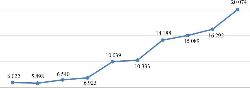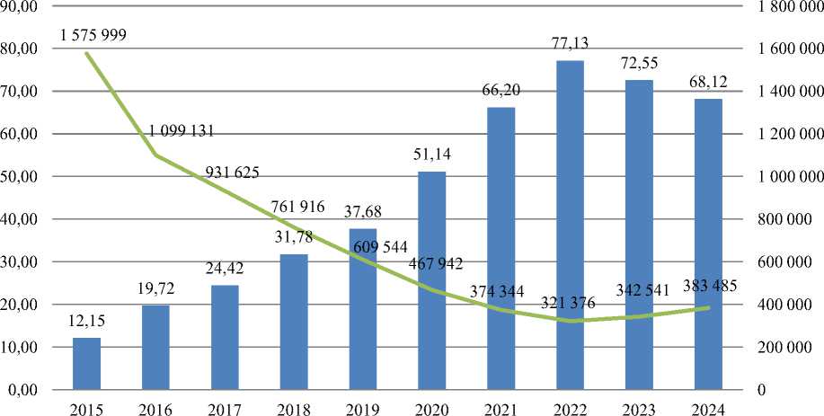 Как видно из рис. 2, в промежуток с 2015 по 2022 год наблюдался рост доли компаний, использовавших цифровые технологии. При этом, исключив из анализа факт сокращения общего количества компаний, можно констатировать, что реальный рост доли компаний, внедряющих цифровизацию бизнес-процессов, за 10 лет составил всего 3,62 %.