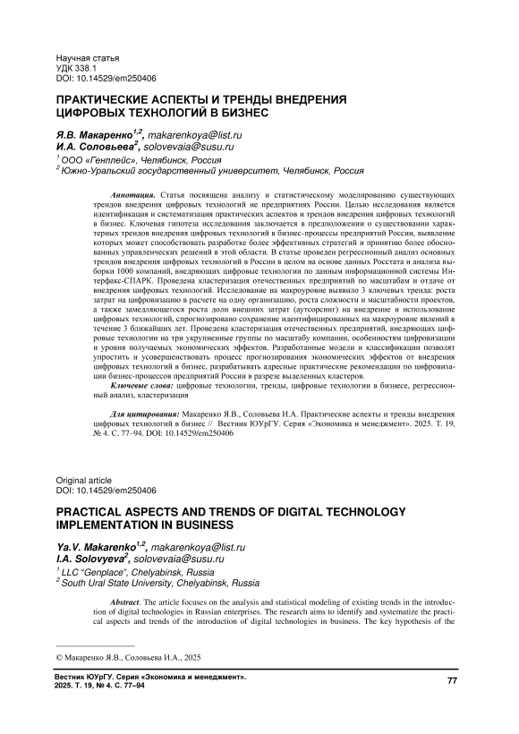 Статья посвящена анализу и статистическому моделированию существующих трендов внедрения цифровых технологий не предприятиях России. Целью исследования является идентификация и систематизация практических аспектов и трендов внедрения цифровых технологий в бизнес. Ключевая гипотеза исследования заключается в предположении о существовании характерных трендов внедрения цифровых технологий в бизнес-процессы предприятий России, выявление которых может способствовать разработке более эффективных стратегий и принятию более обоснованных управленческих решений в этой области. В статье проведен регрессионный анализ основных трендов внедрения цифровых технологий в России в целом на основе данных Росстата и анализа выборки 1000 компаний, внедряющих цифровые технологии по данным информационной системы Интерфакс-СПАРК. Проведена кластеризация отечественных предприятий по масштабам и отдаче от внедрения цифровых технологий. Исследование на макроуровне выявило 3 ключевых тренда: роста затрат на цифровизацию в расчете на одну организацию, роста сложности и масштабности проектов, а также замедляющегося роста доли внешних затрат (аутсорсинг) на внедрение и использование цифровых технологий, спрогнозировано сохранение идентифицированных на макроуровне явлений в течение 3 ближайших лет. Проведена кластеризация отечественных предприятий, внедряющих цифровые технологии на три укрупненные группы по масштабу компании, особенностям цифровизации и уровня получаемых экономических эффектов. Разработанные модели и классификации позволят упростить и усовершенствовать процесс прогнозирования экономических эффектов от внедрения цифровых технологий в бизнес, разрабатывать адресные практические рекомендации по цифровизации бизнес-процессов предприятий России в разрезе выделенных кластеров.