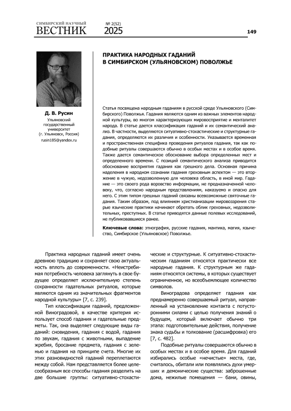 The article is devoted to folk divination in the Russian environment of the Ulyanovsk (Simbirsk) Volga region. Divination is an important element of folk culture, which largely characterizes the worldview and mentality of the people. The article provides a classification of divination and its semantic analysis. In particular, it distinguishes situational-stochastic and structural divination, and identifies their differences and characteristics. The article also discusses the temporal and spatial specifics of divination rituals, as these rituals are usually performed in specific locations and at specific times. It also provides a semantic justification for the choice of certain places and times. From the perspective of semantic analysis, it provides a justification for the perception of fortune-telling as a sinful activity. The main reason for attributing a sinful aspect to fortune-telling in the popular consciousness is the invasion of a forbidden realm, a different world. Divination is a kind of theft of information that is not intended for humans, which, according to popular beliefs, is punishable and dangerous for humans. All kinds of Christmas-related divinations are associated with this type of sinful divination. Thus, under the influence of the Christianization of the worldview, old pagan practices begin to take on the appearance of sinful, forbidden, and criminal practices. The article presents previously unpublished field research data.