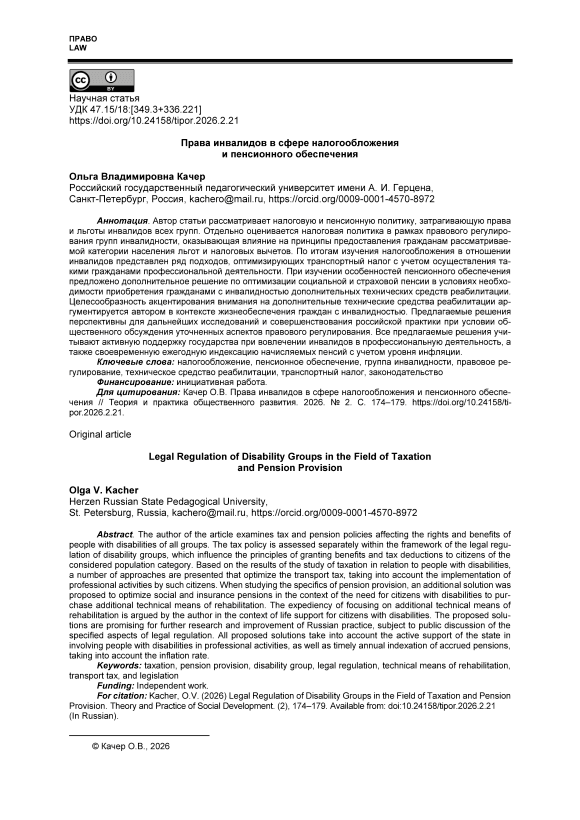 Автор статьи рассматривает налоговую и пенсионную политику, затрагивающую права и льготы инвалидов всех групп. Отдельно оценивается налоговая политика в рамках правового регулирования групп инвалидности, оказывающая влияние на принципы предоставления гражданам рассматриваемой категории населения льгот и налоговых вычетов. По итогам изучения налогообложения в отношении инвалидов представлен ряд подходов, оптимизирующих транспортный налог с учетом осуществления такими гражданами профессиональной деятельности. При изучении особенностей пенсионного обеспечения предложено дополнительное решение по оптимизации социальной и страховой пенсии в условиях необходимости приобретения гражданами с инвалидностью дополнительных технических средств реабилитации. Целесообразность акцентирования внимания на дополнительные технические средства реабилитации аргументируется автором в контексте жизнеобеспечения граждан с инвалидностью. Предлагаемые решения перспективны для дальнейших исследований и совершенствования российской практики при условии общественного обсуждения уточненных аспектов правового регулирования. Все предлагаемые решения учитывают активную поддержку государства при вовлечении инвалидов в профессиональную деятельность, а также своевременную ежегодную индексацию начисляемых пенсий с учетом уровня инфляции.