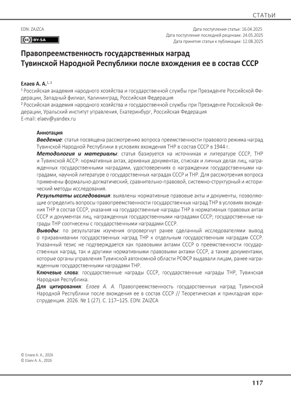 Введение: статья посвящена рассмотрению вопроса преемственности правового режима наград Тувинской Народной Республики в условиях вхождения ТНР в состав СССР в 1944 г. Методология и материалы: статья базируется на источниках и литературе СССР, ТНР и Тувинской АССР: нормативных актах, архивных документах, списках и личных делах лиц, награжденных государственными наградами, удостоверениях о награждении государственными наградами, научной литературе о государственных наградах СССР и ТНР. Для рассмотрения вопроса применены формально-догматический, сравнительно-правовой, системно-структурный и исторический методы исследования. Результаты исследования: выявлены нормативные правовые акты и документы, позволяющие определить вопросы правопреемственности государственных наград ТНР в условиях вхождения ТНР в состав СССР, указания на государственные награды ТНР в нормативных правовых актах СССР и документах лиц, награжденных государственными наградами СССР; государственные награды ТНР соотнесены с государственными наградами СССР. Выводы: по результатам изучения опровергнут ранее сделанный исследователями вывод о приравнивании государственных наград ТНР к отдельным государственным наградам СССР. Указанный тезис не подтверждается как правовыми актами СССР о преемственности государственных наград, так и другими нормативными правовыми актами СССР, а также документами, которые органы управления Тувинской автономной области РСФСР выдавали лицам, ранее награжденным государственными наградами ТНР.