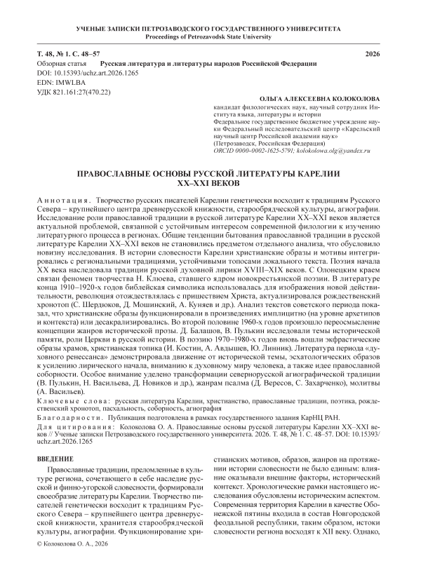 стианских мотивов, образов, жанров на протяжении истории словесности не было единым: влияние оказывали внешние факторы, исторический контекст. Хронологические рамки настоящего исследования обусловлены историческим аспектом. Современная территория Карелии в качестве Обо-нежской пятины входила в состав Новгородской феодальной республики, таким образом, истоки словесности региона восходят к XII веку. Однако, несмотря на традиции древнерусской литературы и труды писателей Нового времени, русская литература Карелии как единая система сформировалась в ХХ веке, а точнее – после 1917 года [17: 3–10]. Настоящее исследование не претендует на исчерпывающий обзор материала за период, охватывающий более ста лет. Тем не менее результаты предпринятого анализа позволят выявить общие тенденции и закономерности, а также обозначить отдельные доминанты в рецепции православной традиции. Предполагаем, что сделанные в ходе работы наблюдения внесут вклад в изучение более глобальной темы «Литература Европейского Севера России и христианство», а также послужат основой для аналитических исследований, посвященных отдельным проблемам поэтики художественного текста. Изучение роли православной культуры, ее влияния на поэтику художественного текста в диахроническом срезе является актуальной проблемой, связанной с устойчивым интересом современной науки к изучению литературного процесса в регионах. Результаты анализа дают возможность выявить духовные доминанты и общие закономерности развития словесности Карелии.