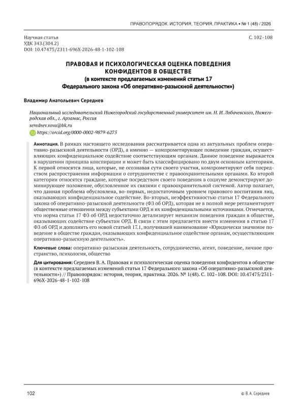 Правовая и психологическая оценка поведения конфидентов в обществе (в контексте предлагаемых изменений статьи 17 Федерального закона «Об оперативно-разыскной деятельности»)