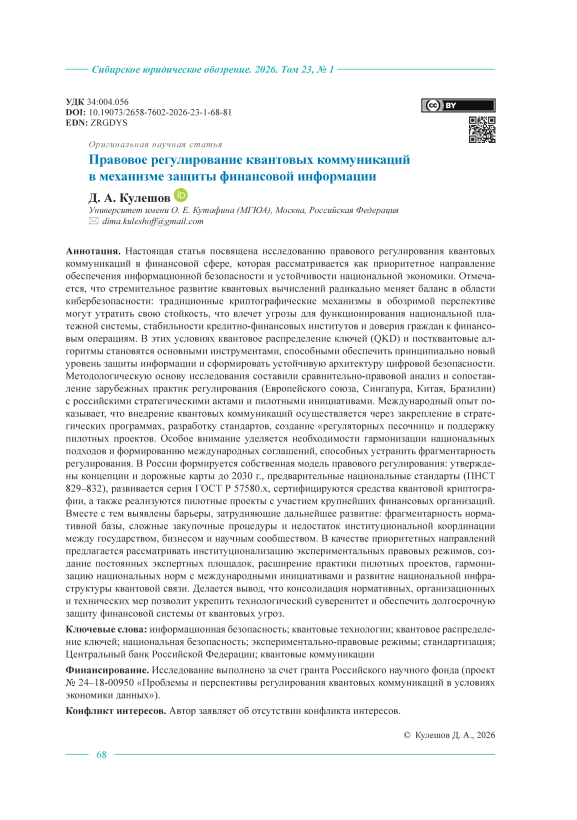 Настоящая статья посвящена исследованию правового регулирования квантовых коммуникаций в финансовой сфере, которая рассматривается как приоритетное направление обеспечения информационной безопасности и устойчивости национальной экономики. Отмечается, что стремительное развитие квантовых вычислений радикально меняет баланс в области кибербезопасности: традиционные криптографические механизмы в обозримой перспективе могут утратить свою стойкость, что влечет угрозы для функционирования национальной платежной системы, стабильности кредитно-финансовых институтов и доверия граждан к финансовым операциям. В этих условиях квантовое распределение ключей (QKD) и постквантовые алгоритмы становятся основными инструментами, способными обеспечить принципиально новый уровень защиты информации и сформировать устойчивую архитектуру цифровой безопасности. Методологическую основу исследования составили сравнительно-правовой анализ и сопоставление зарубежных практик регулирования (Европейского союза, Сингапура, Китая, Бразилии) с российскими стратегическими актами и пилотными инициативами. Международный опыт показывает, что внедрение квантовых коммуникаций осуществляется через закрепление в стратегических программах, разработку стандартов, создание «регуляторных песочниц» и поддержку пилотных проектов. Особое внимание уделяется необходимости гармонизации национальных подходов и формированию международных соглашений, способных устранить фрагментарность регулирования. В России формируется собственная модель правового регулирования: утверждены концепции и дорожные карты до 2030 г., предварительные национальные стандарты (ПНСТ 829–832), развивается серия ГОСТ Р 57580.x, сертифицируются средства квантовой криптографии, а также реализуются пилотные проекты с участием крупнейших финансовых организаций. Вместе с тем выявлены барьеры, затрудняющие дальнейшее развитие: фрагментарность нормативной базы, сложные закупочные процедуры и недостаток институциональной координации между государством, бизнесом и научным сообществом. В качестве приоритетных направлений предлагается рассматривать институционализацию экспериментальных правовых режимов, создание постоянных экспертных площадок, расширение практики пилотных проектов, гармонизацию национальных норм с международными инициативами и развитие национальной инфраструктуры квантовой связи. Делается вывод, что консолидация нормативных, организационных и технических мер позволит укрепить технологический суверенитет и обеспечить долгосрочную защиту финансовой системы от квантовых угроз.