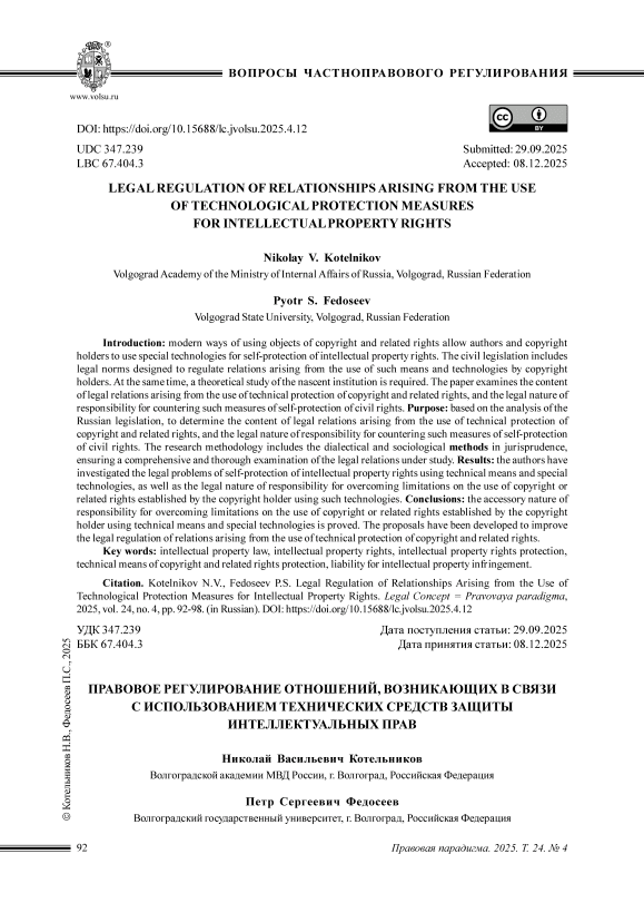 Введение: современные способы использования объектов авторского права и смежных прав позволяют авторам и правообладателям использовать специальные технологии для самозащиты интеллектуальных прав. В гражданское законодательство включены правовые нормы, предназначенные для регулирования отношений, возникающих в связи с использованием правообладателями таких средств и технологий. Вместе с тем требуется теоретическое исследование зарождающегося института. В настоящей работе изучаются содержание правоотношений, возникающих в связи с применением средств технической защиты авторских и смежных прав, и правовая природа ответственности за противодействие таким мерам самозащиты гражданских прав. Цель: на основе анализа российского законодательства определить содержание правоотношений, возникающих в связи с применением средств технической защиты авторских и смежных прав, и правовую природу ответственности за противодействие таким мерам самозащиты гражданских прав. Методология исследования включает диалектический и социологический методы в юриспруденции, обеспечивающие всестороннее и полное изучение исследуемых правоотношений. Результаты: авторами исследованы правовые проблемы самозащиты интеллектуальных прав с помощью технических средств и специальных технологий, а также правовая природа ответственности за преодоление ограничений использования объектов авторского или смежных прав, установленных правообладателем с помощью таких технологий. Выводы: доказан акцессорный характер ответственности за преодоление ограничений использования объектов авторского или смежных прав, установленных правообладателем с помощью технических средств и специальных технологий. Выработаны предложения по совершенствованию правового регулирования отношений, возникающих в связи с применением средств технической защиты авторских и смежных прав.