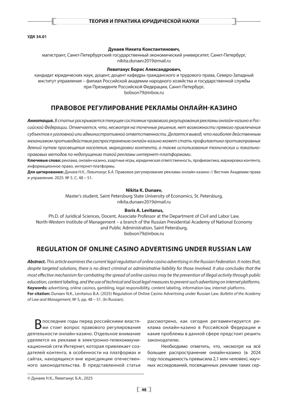 В статье раскрывается текущее состояние правового регулирования рекламы онлайн-казино в Российской Федерации. Отмечается, что, несмотря на точечные решения, нет возможности прямого привлечения субъектов к уголовной или административной ответственности. Делается вывод, что наиболее действенным механизмом противодействия распространению онлайн-казино может стать профилактика противоправных деяний путем просвещения населения, маркировки контента, а также использования технических и локальноправовых методов по недопущению такой рекламы интернет-платформами.