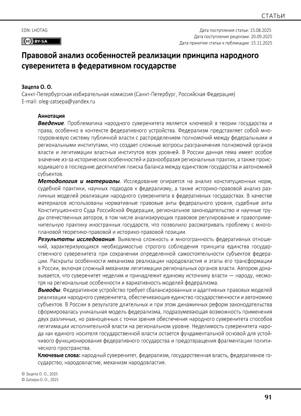 Введение. Проблематика народного суверенитета является ключевой в теории государства и права, особенно в контексте федеративного устройства. Федерализм представляет собой многоуровневую систему публичной власти с распределением полномочий между федеральными и региональными институтами, что создает сложные вопросы разграничения полномочий органов власти и легитимации властных институтов всех уровней. В России данная тема имеет особое значение из-за исторических особенностей и разнообразия региональных практик, а также происходившего в последние десятилетия поиска баланса между единством государства и автономией субъектов. Методология и материалы. Исследование опирается на анализ конституционных норм, судебной практики, научных подходов к федерализму, а также историко-правовой анализ различных моделей реализации народного суверенитета в федеративных государствах. В качестве материалов использованы нормативные правовые акты федерального уровня, судебные акты Конституционного Суда Российской Федерации, региональное законодательство и научные труды отечественных авторов, в том числе анализирующих правовое регулирование и правоприменительную практику иностранных государств, что позволило рассматривать проблему с многоплановой теоретико-правовой и историко-правовой позиции. Результаты исследования. Выявлена сложность и многогранность федеративных отношений, характеризующихся необходимостью строгого соблюдения принципа единства государственного суверенитета при сохранении определенной самостоятельности субъектов федерации. Раскрыты особенности механизма реализации народовластия и этапы его трансформации в России, включая сложный механизм легитимации региональных органов власти. Автором доказывается, что суверенитет неделим и принадлежит единому источнику власти — народу, несмотря на региональные особенности и вариативность моделей федерализма. Выводы. Федеративное устройство требует сбалансированных и адаптивных правовых моделей реализации народного суверенитета, обеспечивающих единство государственности и автономию субъектов. В России в результате длительных и при этом динамичных реформ законодательства сформировалась уникальная модель федерализма, подразумевающая возможность применения двух различных, но равноценных с точки зрения обеспечения народного суверенитета способов легитимации исполнительной власти на региональном уровне. Неделимость суверенитета народа как единого носителя государственной власти остается фундаментальной основой для устойчивого функционирования федеративного государства и предотвращения фрагментации политического пространства.