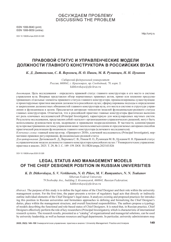 Текст научной статьи Правовой статус и управленческие модели должности главного конструктора в российских вузах