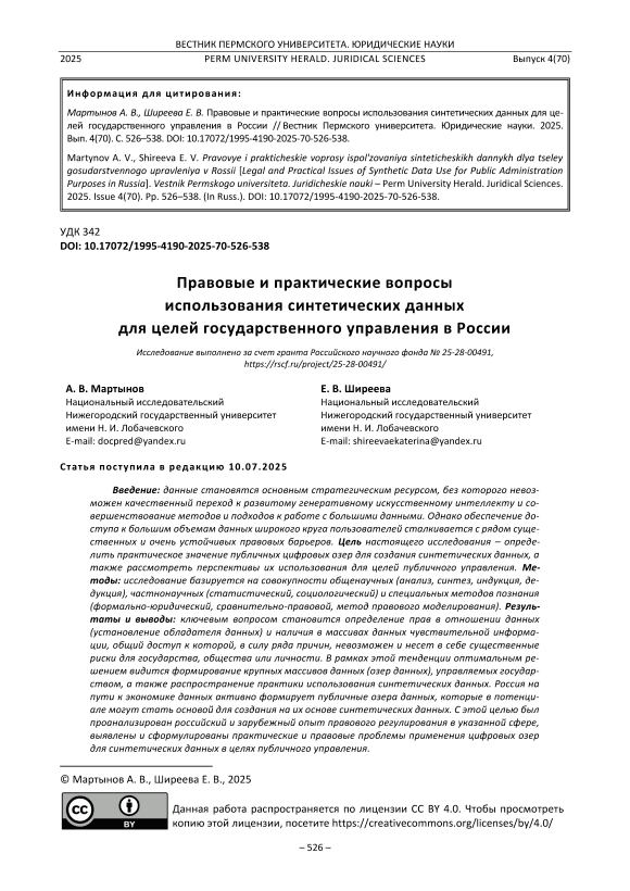 Синтетические данные; озеро данных; государственное управление; органы исполнительной власти; искусственный интеллект; правовое регулирование; генеративный искусственный интеллект; машинное обучение