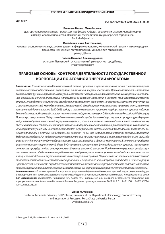В статье проведён комплексный анализ правовых и организационных основ системы контроля деятельности государственной корпорации по атомной энергии «Росатом». Цель исследования – выявление особенностей функционирования многоуровневой модели надзора, сочетающей внешние и внутренние контрольные механизмы, а также определение направлений её совершенствования в условиях трансформации атомной отрасли. Методологическую основу исследования составляют сравнительно-правовой, системно-структурный и институциональный методы анализа. Эмпирической базой служат нормативные правовые акты, практика контрольной деятельности 2020-2025 годов, а также материалы проверок государственных органов надзора. Внешний контур надзора представлен полномочиями и формами проверок Счётной палаты Российской Федерации, Министерства финансов, Федеральной антимонопольной службы, Ростехнадзора и органов прокуратуры. Внутренний уровень образован системой внутреннего аудита, комплаенс-механизмами и обязательной отчётностью, обеспечивающими соблюдение корпоративных стандартов и государственной регламентации. Установлено, что нормативную основу контроля составляет иерархическая система актов: Федеральный закон № 317-ФЗ «О госкорпорации «Росатом»» и Федеральный закон № 170-ФЗ «Об использовании атомной энергии», положения Бюджетного кодекса РФ, подзаконные акты и внутренние приказы корпорации, включая утверждённые в 2020 году формы отчётности по учёту радиоактивных веществ, отходов и ядерных материалов. Выявленные проблемы: фрагментарность нормативной базы, дублирование контрольных функций различных органов, техническая сложность процедур учёта специфических объектов атомной отрасли. Предложенные решения: унификация локальных актов с федеральными требованиями, внедрение риск-ориентированного подхода к контролю, оптимизация взаимодействия внутренних и внешних контрольных органов. Научная новизна заключается в системной типологии контрольных механизмов госкорпорации и разработке концептуальных подходов к их интеграции. Практическая значимость определяется возможностью использования результатов для совершенствования правового регулирования деятельности государственных корпораций в стратегических отраслях экономики.