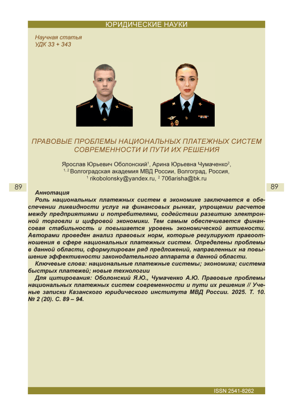 Роль национальных платежных систем в экономике заключается в обеспечении ликвидности услуг на финансовых рынках, упрощении расчетов между предприятиями и потребителями, содействии развитию электронной торговли и цифровой экономики. Тем самым обеспечивается финансовая стабильность и повышается уровень экономической активности. Авторами проведен анализ правовых норм, которые регулируют правоотношения в сфере национальных платежных систем. Определены проблемы в данной области, сформулирован ряд предложений, направленных на повышение эффективности законодательного аппарата в данной области.