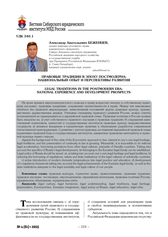 Актуальность темы определяется тем, что в Российской Федерации практически отсутству- ют теоретические исследования, посвященные определению характера и роли отечественного правового наследия в условиях современной глобализации и евразийской интеграции. Суть рассмотренной в научном материале проблемы выражена в: а) анализе современного состояния правовой и государственной сферы с учетом диалога правовых культур и активного взаимодействия государств в глобализирующемся мире; б) определении значения правового наследия в дальнейшем правовом развитии; в) выделении специфики юридического образа постмодерна; г) рассмотрении правовой культуры и государственных институтов России как надлежащих.
