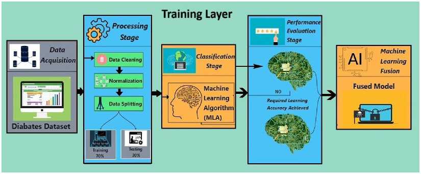 Diabetes is a long-term condition that occurs when the pancreas either fails to produce sufficient insulin or the produced insulin cannot be used effectively or adequately. Insulin functions as a vital facilitator; it transfers glucose from the bloodstream into the body’s cells to produce energy. As the body converts carbohydrates into blood glucose, insulin’s function in enabling glucose transport into cells is crucial. The inability to utilize insulin effectively leads to elevated blood glucose levels, known as hyperglycemia. Chronic hyperglycemia is associated with injury and impairment across multiple organs and tissues. Given the urgency of tackling such lethal diseases, a sophisticated ML-based diagnostic system is considered imperative [1]. Artificial Intelligence (AI) has been ingeniously integrated into medical diagnostic systems to detect diseases. In line with this, the research proposes an early detection system for diabetic patients, leveraging machine learning (ML) and introducing a conceptual framework for its implementation.