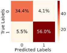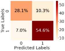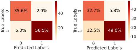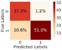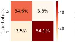 Fig. 5. shows the CM after testing with the test dataset. Fig. 5 (a) shows CM using LR, with TN = 34.6%, TP = 54.6%, FN = 7%, and FP = 3.8%. Fig. 5(b) shows CM using SVM, with TN = 35.3%, TP = 56.5%, FN = 5.0%, and FP = 3.1%. Fig. 5(c) shows CM using DT, with TN = 33.4%, TP = 48.6%, FN = 13%, and FP = 5.4%. Fig. 5(d) shows CM using RF, with TN = 34.6%, TP = 56.0%, FN = 5.5%, and FP = 3.8%. Fig. 5(e) shows CM using k-NN, with TN = 37.3%, TP = 52.2%, FN = 9.4%, and FP = 1.2%. Fig. 5(f) shows CM using NN, with TN = 37.3%, TP = 50.7%, FN = 10.8%, and FP = 1.2%. Hear, although all the ML models perform well comparatively. It can be observed that the higher predictability of all the models is in correctly predicting the TN and the TP. On the other hand, the FN and the FP rates are close across all methods, but the SVM yields the lowest FN rate. Thus, overall, SVM performs better.