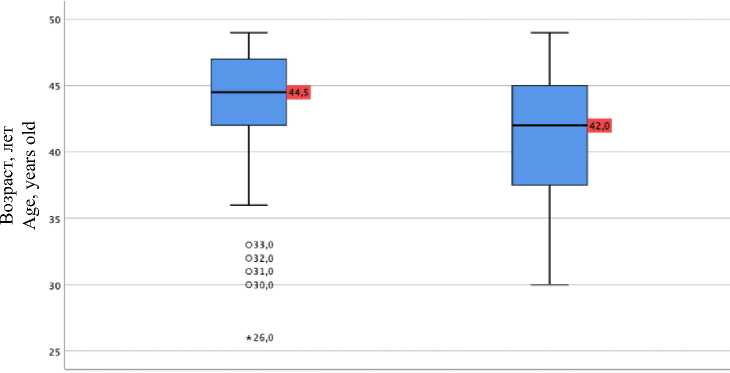 Пациентки с рецидивом ЛМ были достоверно моложе: медиана их возраста составила 42 года, тогда как у женщин без рецидива – 44 года (р=0,027). Шансы развития рецидива ЛМ у пациенток в возрасте 42 лет и менее увеличиваются в 3 раза (ОШ=3,2; 95 % ДИ 1,16–8,87).