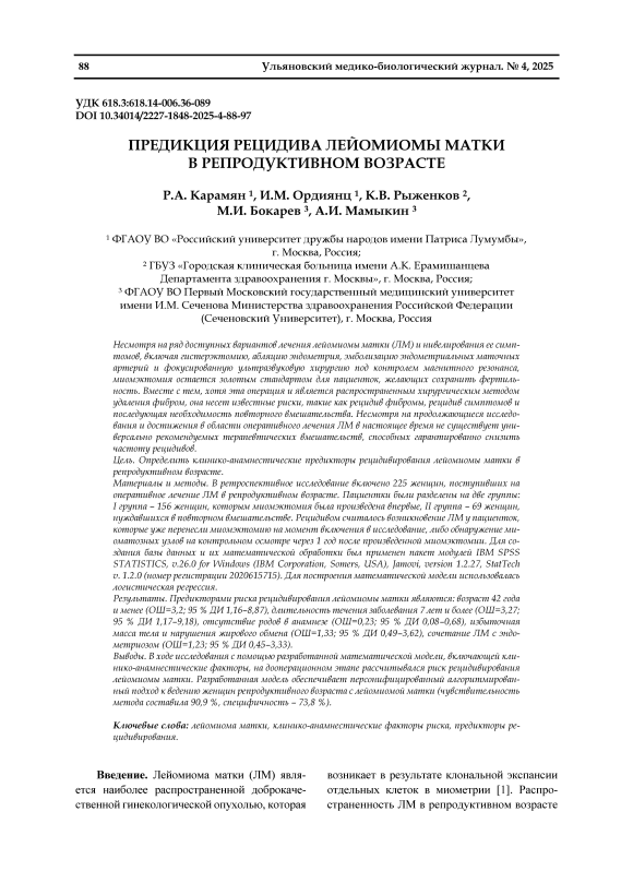 Несмотря на ряд доступных вариантов лечения лейомиомы матки (ЛМ) и нивелирования ее симптомов, включая гистерэктомию, абляцию эндометрия, эмболизацию эндометриальных маточных артерий и фокусированную ультразвуковую хирургию под контролем магнитного резонанса, миомэктомия остается золотым стандартом для пациенток, желающих сохранить фертильность. Вместе с тем, хотя эта операция и является распространенным хирургическим методом удаления фибром, она несет известные риски, такие как рецидив фибромы, рецидив симптомов и последующая необходимость повторного вмешательства. Несмотря на продолжающиеся исследования и достижения в области оперативного лечения ЛМ в настоящее время не существует универсально рекомендуемых терапевтических вмешательств, способных гарантированно снизить частоту рецидивов. Цель. Определить клинико-анамнестические предикторы рецидивирования лейомиомы матки в репродуктивном возрасте. Материалы и методы. В ретроспективное исследование включено 225 женщин, поступивших на оперативное лечение ЛМ в репродуктивном возрасте. Пациентки были разделены на две группы: I группа – 156 женщин, которым миомэктомия была произведена впервые, II группа – 69 женщин, нуждавшихся в повторном вмешательстве. Рецидивом считалось возникновение ЛМ у пациенток, которые уже перенесли миомэктомию на момент включения в исследование, либо обнаружение миоматозных узлов на контрольном осмотре через 1 год после произведенной миомэктомии. Для создания базы данных и их математической обработки был применен пакет модулей IBM SPSS STATISTICS, v.26.0 for Windows (IBM Corporation, Somers, USA), Jamovi, version 1.2.27, StatTech v. 1.2.0 (номер регистрации 2020615715). Для построения математической модели использовалась логистическая регрессия. Результаты. Предикторами риска рецидивирования лейомиомы матки являются: возраст 42 года и менее (ОШ=3,2; 95 % ДИ 1,16–8,87), длительность течения заболевания 7 лет и более (ОШ=3,27; 95 % ДИ 1,17–9,18), отсутствие родов в анамнезе (ОШ=0,23; 95 % ДИ 0,08–0,68), избыточная масса тела и нарушения жирового обмена (ОШ=1,33; 95 % ДИ 0,49–3,62), сочетание ЛМ с эндометриозом (ОШ=1,23; 95 % ДИ 0,45–3,33). Выводы. В ходе исследования с помощью разработанной математической модели, включающей клинико-анамнестические факторы, на дооперационном этапе рассчитывался риск рецидивирования лейомиомы матки. Разработанная модель обеспечивает персонифицированный алгоритмированный подход к ведению женщин репродуктивного возраста с лейомиомой матки (чувствительность метода составила 90,9 %, специфичность – 73,8 %).