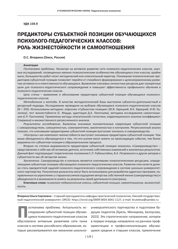 Постановка проблемы. Несмотря на активное развитие сети психолого-педагогических классов, научных исследований, посвященных именно психологическим особенностям обучающихся этих классов, крайне мало, большинство работ носит методический или описательный характер. Понимание психологических предикторов субъектной позиции позволяет перейти от стихийного формирования к целенаправленному развитию активности и ответственности обучающихся. Выявление ключевых личностных ресурсов дает конкретные цели для психолого-педагогического сопровождения и повышает эффективность профильного обучения в психолого-педагогических классах. Цель статьи – выявление и обоснование предикторов субъектной позиции обучающихся психолого- педагогических классов. Методология и методы. В качестве методологической базы выступили субъектно-деятельностный и ресурсный подходы. Исследование проводили на выборке обучающихся психолого-педагогических классов (N = 293). Использованы методики: опросник «Субъектная позиция» (Ю.В. Зарецкий, В.К. Зарецкий, И.Ю. Кулагина), тест жизнестойкости (С. Мадди, адаптация Д.А. Леонтьева), методика исследования самоотношения (С.Р. Пантилеев). Применены методы описательной статистики, корреляционного анализа (коэффициент Спирмена) и множественного регрессионного анализа. Результаты исследования. Выявлены значимые положительные корреляции субъектной позиции с саморуководством, самоценностью, самопринятием, вовлеченностью и контролем. Регрессионный анализ показал, что ключевыми предикторами субъектной позиции выступают контроль и саморуководство. «Контроль» как компонент жизнестойкости выступает значимым предиктором субъектной позиции. Чем выше убежденность обучающегося в том, что его усилия могут влиять на происходящие события, тем более выражена его субъектная позиция в образовательном процессе. Вторым по степени выраженности предиктором субъектной позиции оказалось «Саморуководство» – представление о себе как об активном деятеле, источнике собственных изменений и жизненных результатов. Данный факт подтверждает теоретические положения С.Л. Рубинштейна, В.А. Петровского и других авторов о субъектности как об авторстве жизни. Заключение. Саморуководство и контроль являются ключевыми психологическими ресурсами, определяющими субъектную позицию обучающихся психолого-педагогических классов. Развитие этих качеств должно стать приоритетной задачей психолого-педагогического сопровождения в системе школьно-университетского партнерства. Полученные результаты могут быть использованы для разработки адресных программ, направленных на укрепление у старшеклассников ощущения авторства собственной жизни (саморуководство) и убежденности в возможности влиять на результаты своей деятельности (контроль).
