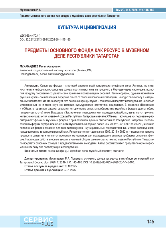The main funds are the key element of the entire structure of museum work. Being essentially carriers of information, the main funds stretch the thread from the past to the future through the present, allowing each generation to create its own interpretations of the events that took place. Thus, one of the most important functions of the museum is socialization, which means the transfer of experience from older generations to younger ones, finds its support in material carriers. It follows from this that the main museum funds are an important subject of research not only in museology, but also in such sciences as history, cultural studies, statistics, and sociology. The sections «Introduction» and «Literature Review» examine the historical aspects of museum funds and provide an overview of the literature on this topic. The section «Conclusion» summarizes the work carried out, identifies the reasons for the intensive development of the museum sector of the Republic of Tatarstan at the beginning of the 21st century. This study examines the phenomenon of museum collections using statistical data from the Republic of Tatarstan. The internal reporting forms of 8 NK museums were used for a period of more than 20 years – from 1999 to 2022. The dynamics of fund replenishment is shown for all types of museums – municipal, state, and museum reserves located on the territory of the republic. Reference points, which are data for 1999, 2015 and 2022, allow us to see the process in development and are the starting material for the subsequent problem analysis of main funds. For the first time, this work introduces statistical data on the museum main funds of the Republic of Tatarstan with preliminary conclusions into scientific circulation. The author considers the presented information as a basis for subsequent research.