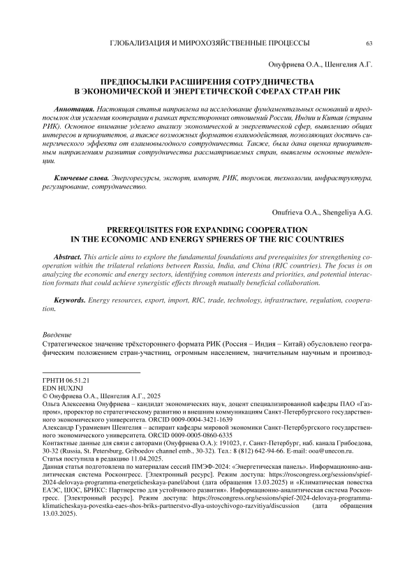 Текст научной статьи Предпосылки расширения сотрудничества в экономической и энергетической сферах стран РИК