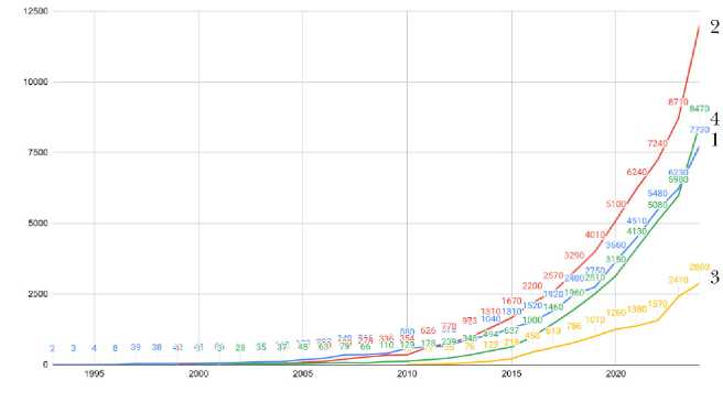 Первоочередной задачей для нас являлся анализ упоминания экосистемных терминов в англоязычной и русскоязычной научной литературе и того, как эволюционировали определения и контекст использования этих терминов. Исследуемый период охватил 35 лет – с 1990 по 2024 г. включительно, так как именно на 90-е гг. приходится активизация усилий по адаптации экосистемного подхода к общественно-научным исследованиям. Источником данных выступила крупнейшая поисковая система по научной литературе Google Scholar, которая, по некоторым данным, индексирует более 389 млн. научных статей [16]. Выбор был сделан в пользу Google Scholar, так как она предоставляет один из лучших полнотекстовых поисков по статьям, а также позволяет статистически проанализировать и англоязычные, и русскоязычные источни-