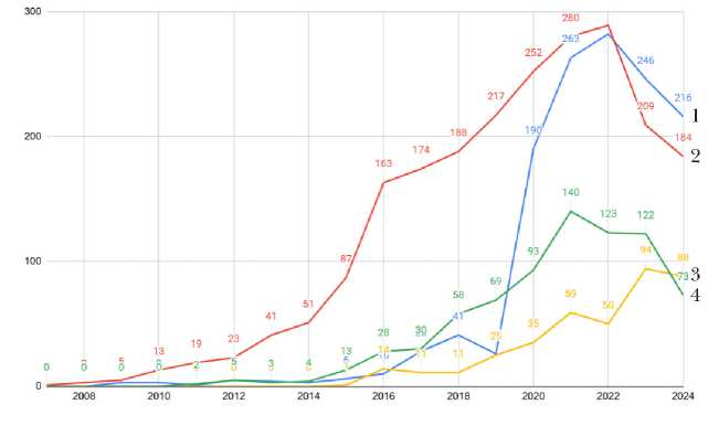 Рис. 2. Количество русскоязычных публикаций с упоминанием «экосистемных» терминов в Google Scholar (2007–2024 гг.)