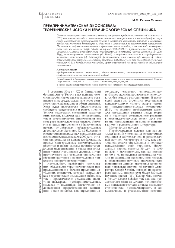 Актуальность настоящего исследования обусловлена терминологической неопределенностью в области предпринимательских экосистем, которая затрудняет как теоретическое осмысление феномена, так и практическую реализацию политики поддержки предпринимательства, создавая у политиков впечатление недостаточной проработанности концепции. Такие понятия, как «предпринима- тельская», «стартап», «инновационная» и «бизнес-экосистема», зачастую используются без четкого разграничения. В настоящей статье мы стремимся восстановить концептуальную ясность вокруг термина «предпринимательская экосистема» (ПЭ), что видится необходимым шагом для преодоления разрыва между теорией и практикой регионального развития в постиндустриальную эпоху. Для этого мы прослеживаем эволюцию понятия в англо- и русскоязычной литературе.