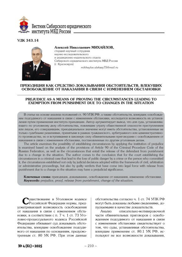Текст научной статьи Преюдиция как средство доказывания обстоятельств, влекущих освобождение от наказания в связи с изменением обстановки