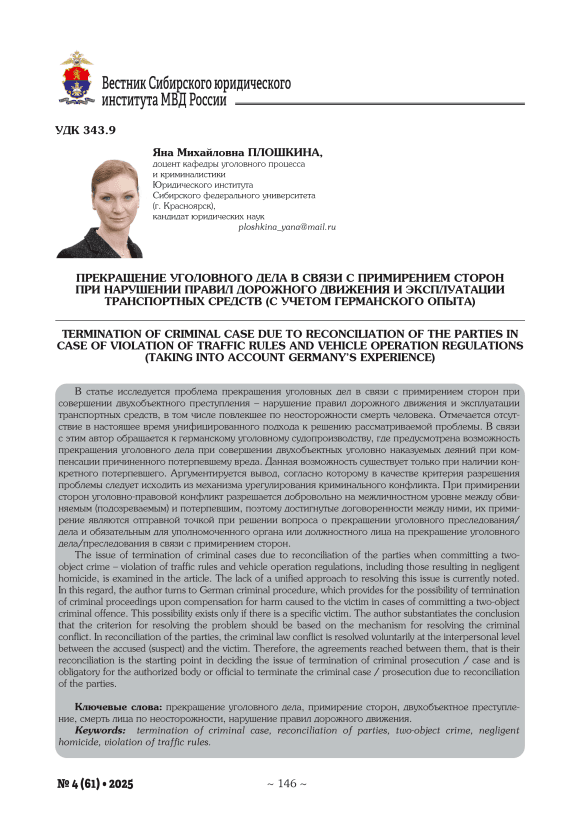 В статье исследуется проблема прекращения уголовных дел в связи с примирением сторон при совершении двухобъектного преступления – нарушение правил дорожного движения и эксплуатации транспортных средств, в том числе повлекшее по неосторожности смерть человека. Отмечается отсутствие в настоящее время унифицированного подхода к решению рассматриваемой проблемы. В связи с этим автор обращается к германскому уголовному судопроизводству, где предусмотрена возможность прекращения уголовного дела при совершении двухобъектных уголовно наказуемых деяний при компенсации причиненного потерпевшему вреда. Данная возможность существует только при наличии конкретного потерпевшего. Аргументируется вывод, согласно которому в качестве критерия разрешения проблемы следует исходить из механизма урегулирования криминального конфликта. При примирении сторон уголовно-правовой конфликт разрешается добровольно на межличностном уровне между обвиняемым (подозреваемым) и потерпевшим, поэтому достигнутые договоренности между ними, их примирение являются отправной точкой при решении вопроса о прекращении уголовного преследования/ дела и обязательным для уполномоченного органа или должностного лица на прекращение уголовного дела/преследования в связи с примирением сторон.