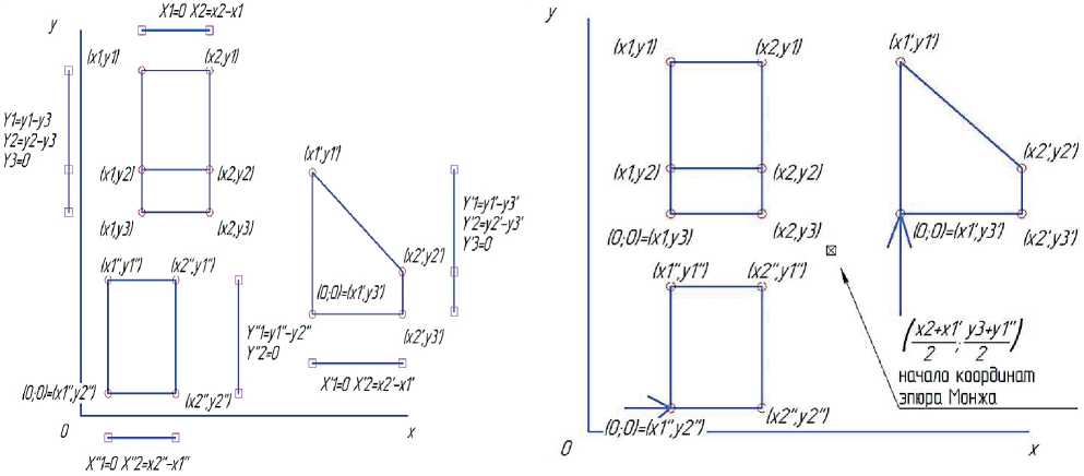 При выделении каждого проекционного вида формируются два проекционных вектора координат точек – один с проекциями элементов вида на ось Ox чертежа, другой – на ось Oy. При добавлении очередного элемента к виду на соответ ствующие оси проецируются две или более его характерных точек (например, концы отрезка). На рисунке 2 показаны исходные проекционные виды и сформированные для них проекционные векторы. При невозможности восстановления проекционных связей между видами только с помощью ограничивающих прямоугольников полученные для каждого выделенного вида оба проекционных вектора сортируются и приводятся к общей точке отсчёта (например, к левому нижнему углу вида). После сортировки проводится сравнение этих векторов различных проекционных видов. Если проекционные векторы совпадают (т.е. разница всех их компонент меньше заранее определённого малого значения ε), то вычисляется вектор сдвига.