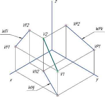 Проводится проверка: является ли потенциальное ребро между двумя 3D точками (V1 и V2) частью искомой каркасной модели. Для этого определяется наличие соответствующего ребра между их 2D проекциями (VF1 и VF2 на фронтальной, VH1 и VH2 на горизонтальной, VP1 и VP2 на профильной проекциях) на всех изображениях (рисунок 4).
