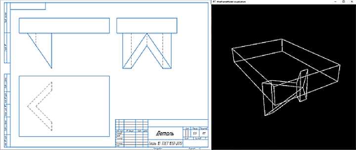 На рисунке 6 приведены чертеж изделия класса «деталь» и трёхмерные модели, полученные реализованным программным комплексом. В среднем для проектирования подобной детали необходимо совершить нескольких десятков формообразующих операций, на каждую из которых затрачивается до нескольких минут; реализованный программный комплекс тратит на создание каркасной модели меньше минуты [21].
