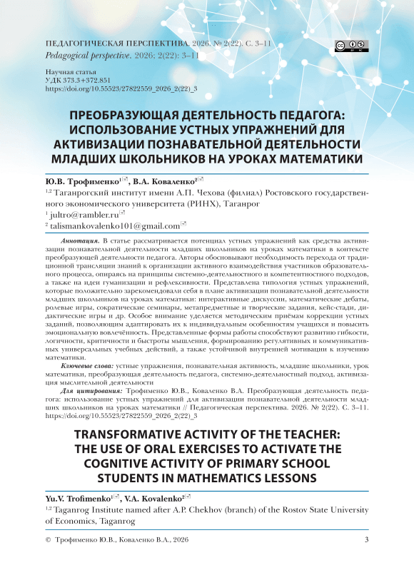 В статье рассматривается потенциал устных упражнений как средства активизации познавательной деятельности младших школьников на уроках математики в контексте преобразующей деятельности педагога. Авторы обосновывают необходимость перехода от традиционной трансляции знаний к организации активного взаимодействия участников образовательного процесса, опираясь на принципы системно-деятельностного и компетентностного подходов, а также на идеи гуманизации и рефлексивности. Представлена типология устных упражнений, которые положительно зарекомендовали себя в плане активизации познавательной деятельности младших школьников на уроках математики: интерактивные дискуссии, математические дебаты, ролевые игры, сократические семинары, метапредметные и творческие задания, кейс-стади, дидактические игры и др. Особое внимание уделяется методическим приёмам коррекции устных заданий, позволяющим адаптировать их к индивидуальным особенностям учащихся и повысить эмоциональную вовлечённость. Представленные формы работы способствуют развитию гибкости, логичности, критичности и быстроты мышления, формированию регулятивных и коммуникативных универсальных учебных действий, а также устойчивой внутренней мотивации к изучению математики.