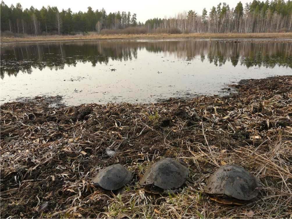 (Pallas, 1771) в нынешнем Борском районе Самарской области и в водоёмах низовьев р. Ток в нынешнем Бузулукском районе Оренбургской области (Pallas, 1776); в прошлом столетии – в Боровом опытном, Колтубанов-ском (Положенцев, 1935; Даркшевич и др., 1940; Даркшевич, 1953; Чибилёв, 1995) и Скобелевском лесничествах (Бакиев, 2001), у ст. Заливная Богатовского района Самарской области (Бакиев, Файзулин, 2002). По нашим наблюдениям, в последние годы единичные черепахи встречаются в Кинельском районе Самарской области у западной границы Национального парка «Бузулукский бор» (в р. Самара при Красносамарском лесничестве). В границах национального парка болотные черепахи постоянно обитают в оз. Пота-пово (Борский район Самарской области), периодически появляются на сообщающихся с ним небольших и быстро пересыхающих озерках Чёрное, Безымянное, Песчаное и Круглинка. Выше по пойме р. Самары они известны в оз. Подгорное, Трёхлапное и ур. Берёзовое. Постоянные встречи отмечаются по крупным плёсам р. Колтубанки, особенно в Новоскобелевском пруду. К берегам этих водоёмов примыкают участки песчаных дюн, на склонах которых в сухом, хорошо прогреваемом грунте черепахи обычно откладывают яйца. Выше, в оренбургской части поймы р. Самары, черепахи изредка встречались в старицах Гороховая, оз. Песчаное, Старица. В центральной части национального парка болотная черепаха постоянно отмечается по крупным плёсам р. Боровки (особенно на участках с корягами, на которых черепахи греются под солнцем), а также на связанных с руслом реки старицах (Державинская, Чер-талыкская, Студёнка, Банное), песчаные берега которых обеспечивают благоприятные условия инкубации яиц. Лимитирующими фак- торами здесь, по-видимому, является лишь быстрое течение и ограниченность кормовых ресурсов. Из озёрно-болотных систем в последние годы черепахи отмечались лишь в оз. Моховое и постоянно обводнённом ур. Светлейшее. Однако весной 2009 г. после зимовки в обмелевшем оз. Светлейшее на его берегах встречены трупы черепах, гибель которых, очевидно, связана с промерзанием водоёма, в котором они зимовали (рис. 1).
