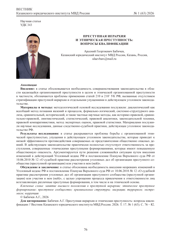 Введение: в статье обосновывается необходимость совершенствования законодательства в области касающейся организованной преступности в целом и этнической организованной преступности в частности, обозначаются проблемы применения статей 210 и 210.1 УК РФ, вызванные отсутствием стратификации преступной иерархии и отдельными упущениями в действующем уголовном законодательстве. Материалы и методы: методологической основой исследования послужили: диалектический как всеобщий метод познания явлений и процессов, формально-логический, системно-структурного анализа, сравнительный, исторический, и такие частные научные методы, как историко-правовой, сравнительно-правовой, лингвистический, статистический, правовой аналитики, законодательной техники, правовой компаративистики, метод экспертных оценок, правовой статистики. Материалами послужили научные исследования, данные следственно-судебной практики, действующее уголовное законодательство РФ. Результаты исследования: в статье раскрываются проблемы борьбы с организованной этнической преступностью, упущения в действующем уголовном законодательстве, которые приводят к низкой эффективности противодействия совершаемых ее представителями общественно опасных деяний. В действующем законодательстве практически полностью отсутствует ответственность за преступления, совершенные этническими преступными формированиями, которые имеют повышенную общественную опасность. Аргументируются пути решения сложившейся ситуации путем внесения изменений в действующий Уголовный кодекс РФ и постановление Пленума Верховного суда РФ от 10.06.2010 №12 «О судебной практике рассмотрения уголовных дел об организации преступного сообщества (преступной организации) или участии в нем (ней)». Обсуждение и заключение: в статье обоснована необходимость внесения назревших изменений в Уголовный кодекс РФ и постановление Пленума Верховного суда РФ от 10.06.2010 №12 «О судебной практике рассмотрения уголовных дел об организации преступного сообщества (преступной организации) или участии в нем (ней)», с целью упрощения процесса привлечения к ответственности лиц возглавляющих различные преступные формирования, в том числе и на этнической основе.