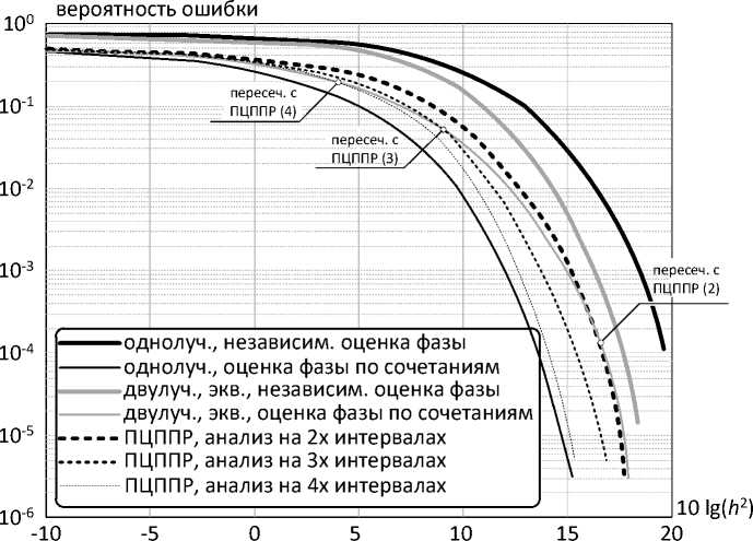 2. Использование 2-х и более интервалов для вынесения решения о передаваемых символах позволяет уменьшить вероятность ошибки, что справедливо как для однолучевого, так и двулучевого канала.