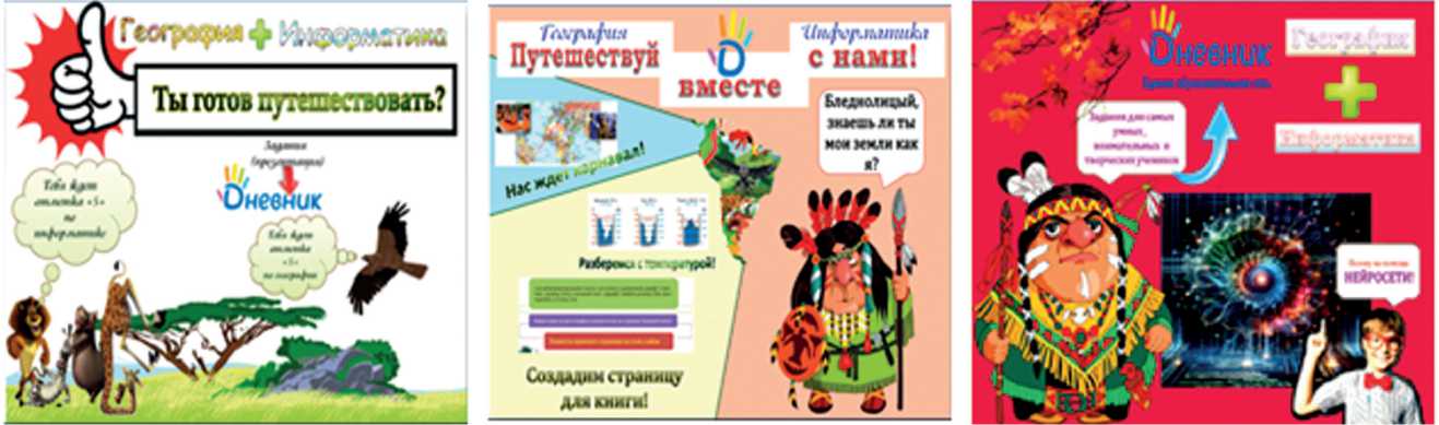 В нашей разработке знакомство учащихся с предстоящим путешествием начинается уже на первых занятиях по географии и информатике при изучении соответствующих тем. Для привлечения внимания учащихся на дверях предметных кабинетов по указанным дисциплинам, а также на экранах телевизоров в коридорах школы размещаются и показываются яркие рекламные флаеры (рис. 1).