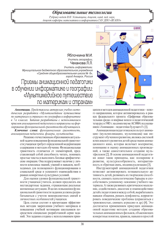 Цель статьи состоит в презентации эффективных методик закрепления учебного материала и повышения учебной мотивации школьников посредством специально разработанной серии заданий. Эти задания созданы с использованием прин- ципов и методов анимационной педагогики – нового направления, которое активизировалось в рамках федерального проекта «Цифровая образовательная среда» и впервые вошло в педагогический тезаурус в 1983 г. на симпозиуме АСИФА под названием «Анимация – педагогика будущего?» [1].