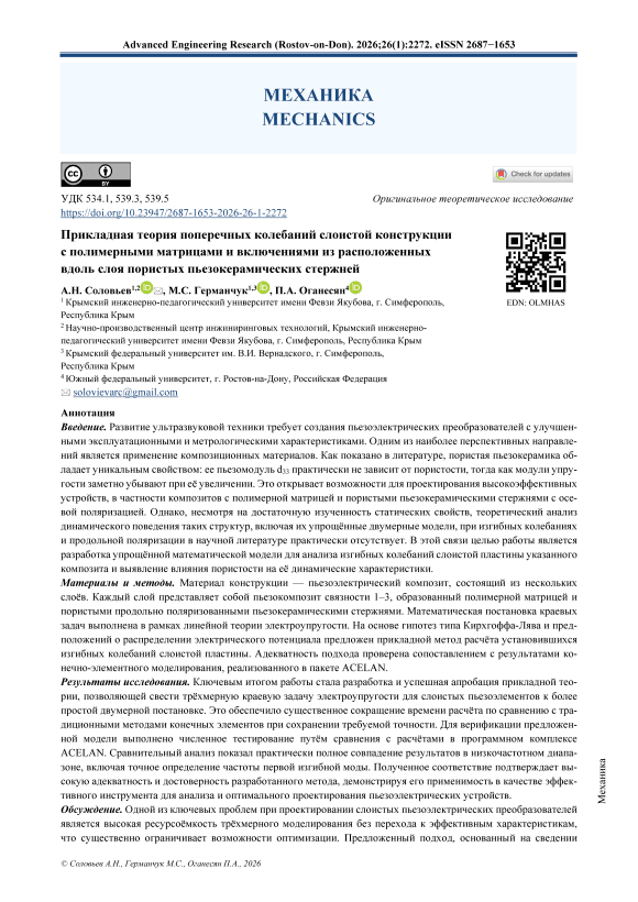 Введение. Развитие ультразвуковой техники требует создания пьезоэлектрических преобразователей с улучшенными эксплуатационными и метрологическими характеристиками. Одним из наиболее перспективных направлений является применение композиционных материалов. Как показано в литературе, пористая пьезокерамика обладает уникальным свойством: ее пьезомодуль d33 практически не зависит от пористости, тогда как модули упругости заметно убывают при её увеличении. Это открывает возможности для проектирования высокоэффективных устройств, в частности композитов с полимерной матрицей и пористыми пьезокерамическими стержнями с осевой поляризацией. Однако, несмотря на достаточную изученность статических свойств, теоретический анализ динамического поведения таких структур, включая их упрощённые двумерные модели, при изгибных колебаниях и продольной поляризации в научной литературе практически отсутствует. В этой связи целью работы является разработка упрощённой математической модели для анализа изгибных колебаний слоистой пластины указанного композита и выявление влияния пористости на её динамические характеристики. Материалы и методы. Материал конструкции — пьезоэлектрический композит, состоящий из нескольких слоёв. Каждый слой представляет собой пьезокомпозит связности 1–3, образованный полимерной матрицей и пористыми продольно поляризованными пьезокерамическими стержнями. Математическая постановка краевых задач выполнена в рамках линейной теории электроупругости. На основе гипотез типа Кирхгоффа-Лява и предположений о распределении электрического потенциала предложен прикладной метод расчёта установившихся изгибных колебаний слоистой пластины. Адекватность подхода проверена сопоставлением с результатами конечно-элементного моделирования, реализованного в пакете ACELAN. Результаты исследования. Ключевым итогом работы стала разработка и успешная апробация прикладной теории, позволяющей свести трёхмерную краевую задачу электроупругости для слоистых пьезоэлементов к более простой двумерной постановке. Это обеспечило существенное сокращение времени расчёта по сравнению с традиционными методами конечных элементов при сохранении требуемой точности. Для верификации предложенной модели выполнено численное тестирование путём сравнения с расчётами в программном комплексе ACELAN. Сравнительный анализ показал практически полное совпадение результатов в низкочастотном диапазоне, включая точное определение частоты первой изгибной моды. Полученное соответствие подтверждает высокую адекватность и достоверность разработанного метода, демонстрируя его применимость в качестве эффективного инструмента для анализа и оптимального проектирования пьезоэлектрических устройств. Обсуждение. Одной из ключевых проблем при проектировании слоистых пьезоэлектрических преобразователей является высокая ресурсоёмкость трёхмерного моделирования без перехода к эффективным характеристикам, что существенно ограничивает возможности оптимизации. Предложенный подход, основанный на сведении трёхмерной задачи к двумерной, представляет значимый шаг вперёд в решении этой проблемы. Его основное преимущество — снижение вычислительных затрат и возможность использования более простого программного инструментар